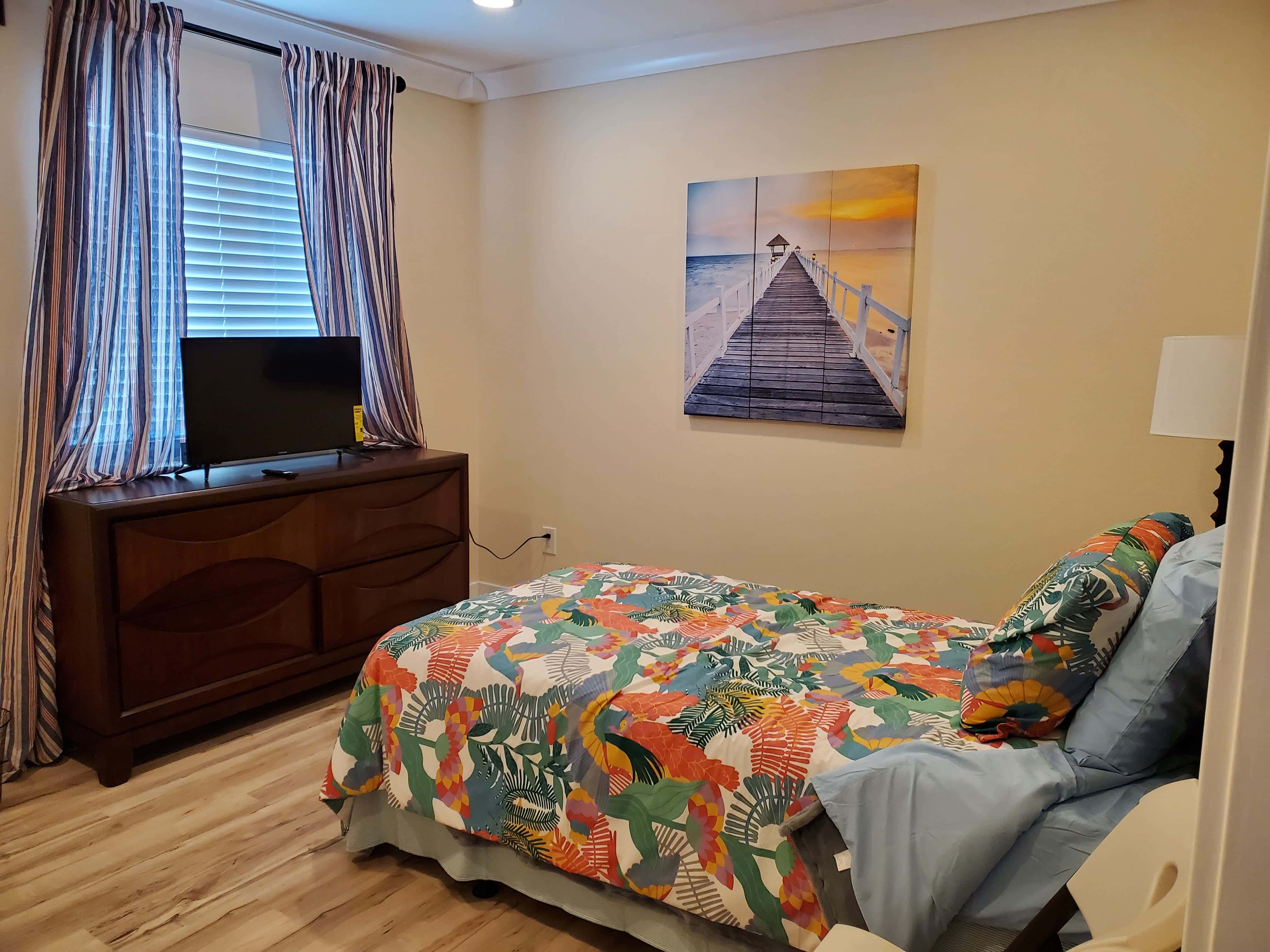 Bedroom is furnished (bed, chair, closet, dresser, and a side table)